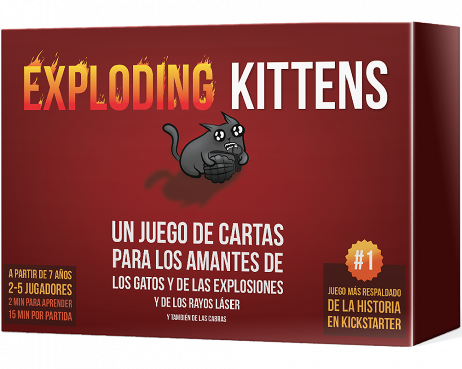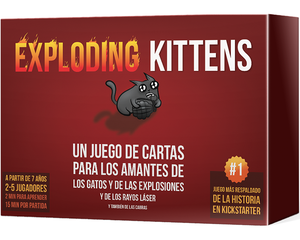 Se trata de una versión gatuna de la ruleta rusa con un gran componente estratégico. Los jugadores van robando cartas hasta que a alguien le sale un Exploding Kitten. Cuando esto sucede, esa persona muere y queda eliminada de la partida (a no ser que tenga una carta de Desactivación, que permite desactivar al Exploding Kitten con armas como punteros láser, friegas de barriga o bocatas de menta gatuna). El resto de las cartas de la baraja sirven para cambiar de lugar, mitigar o evitar a los Exploding Kittens.
